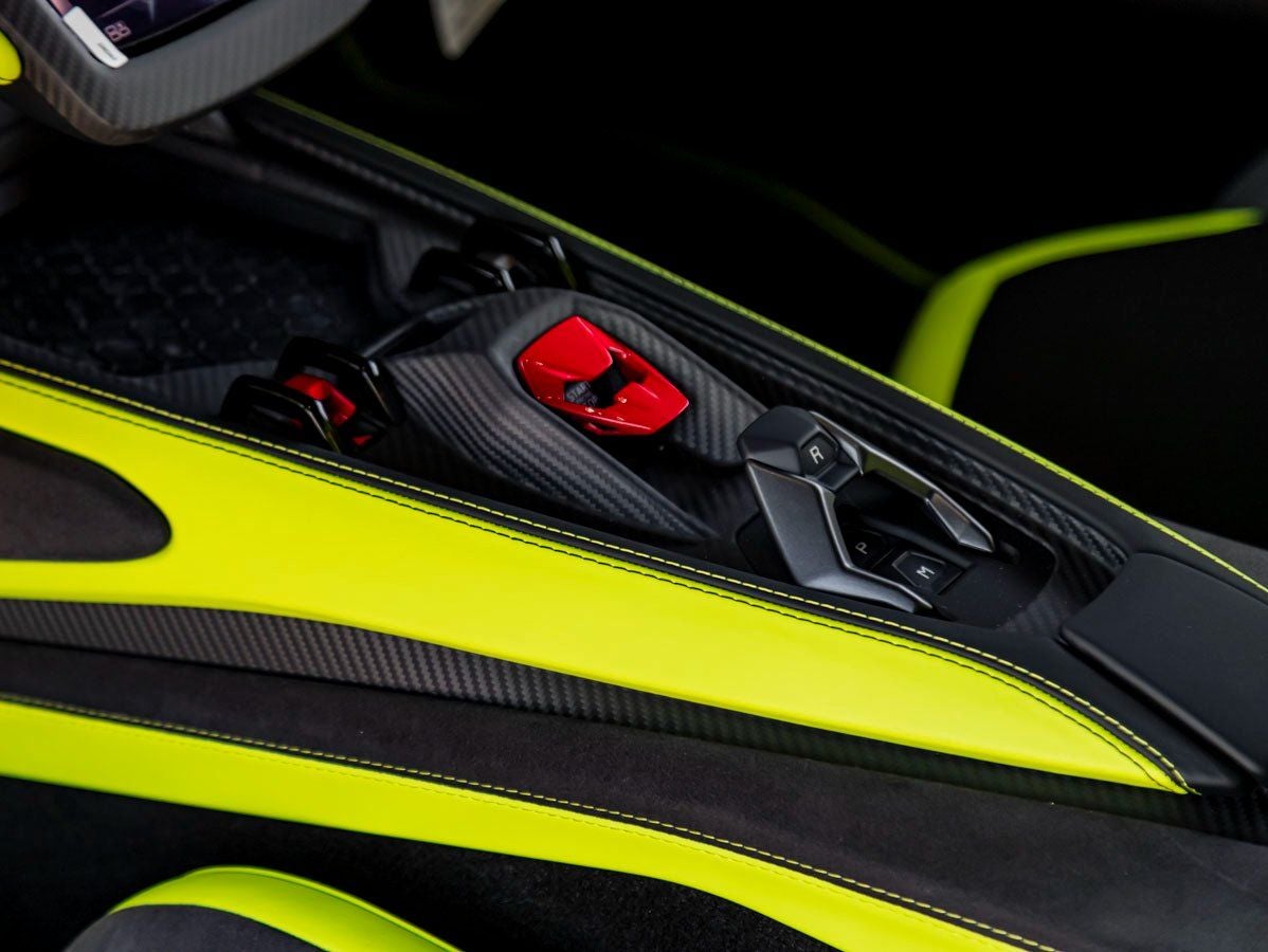The commanding exterior of the 2025 Revuelto is enhanced by Altanero Shiny Black Diamond Cut Rims, Verde Chiaro Brake Calipers, Matt Black Exhaust Tailpipes, and a Shiny Black Lamborghini Rear Logo. A Verde Scandal Livery Stripe adds vibrant contrast, while the Lower and Upper Exterior Carbon Packages in Shiny Finish and Aerodynamic Carbon Door Fins create a dramatic, high-performance presence.