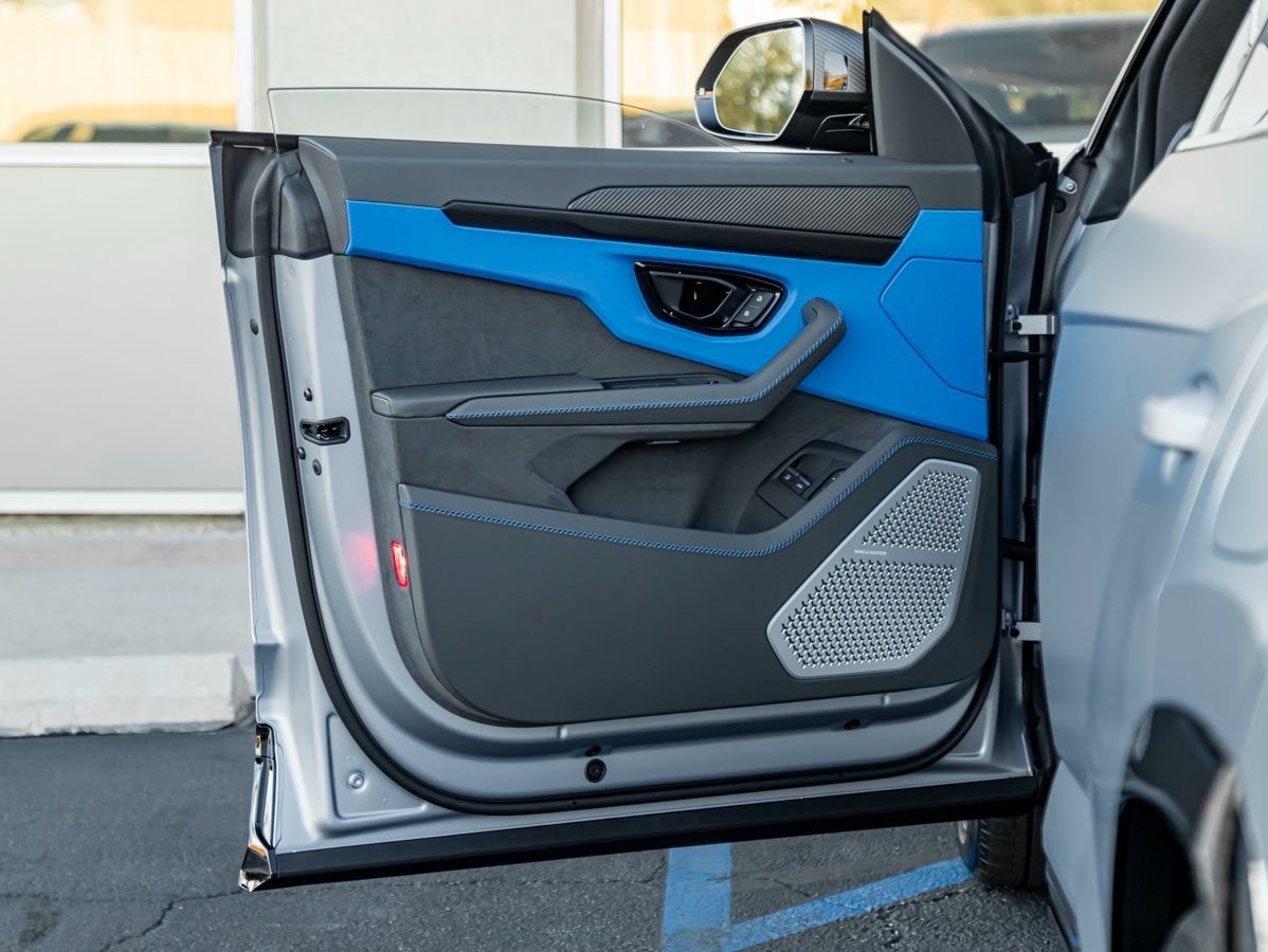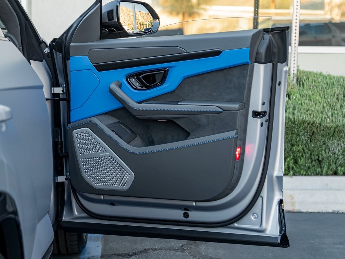 The Urus SE evolves the iconic silhouette with sharpened aerodynamics and powerful design cues. Its 23 Rims Galanthus in Shiny Black, Style Package Full in High Gloss Black, and Rear Spoiler in High Gloss Black give the SUV a dynamic presence. Distinctive details such as Mirror Housings in Matt Carbon and Seat Belts in Blu Amon highlight Lamborghinis attention to bespoke personalization.