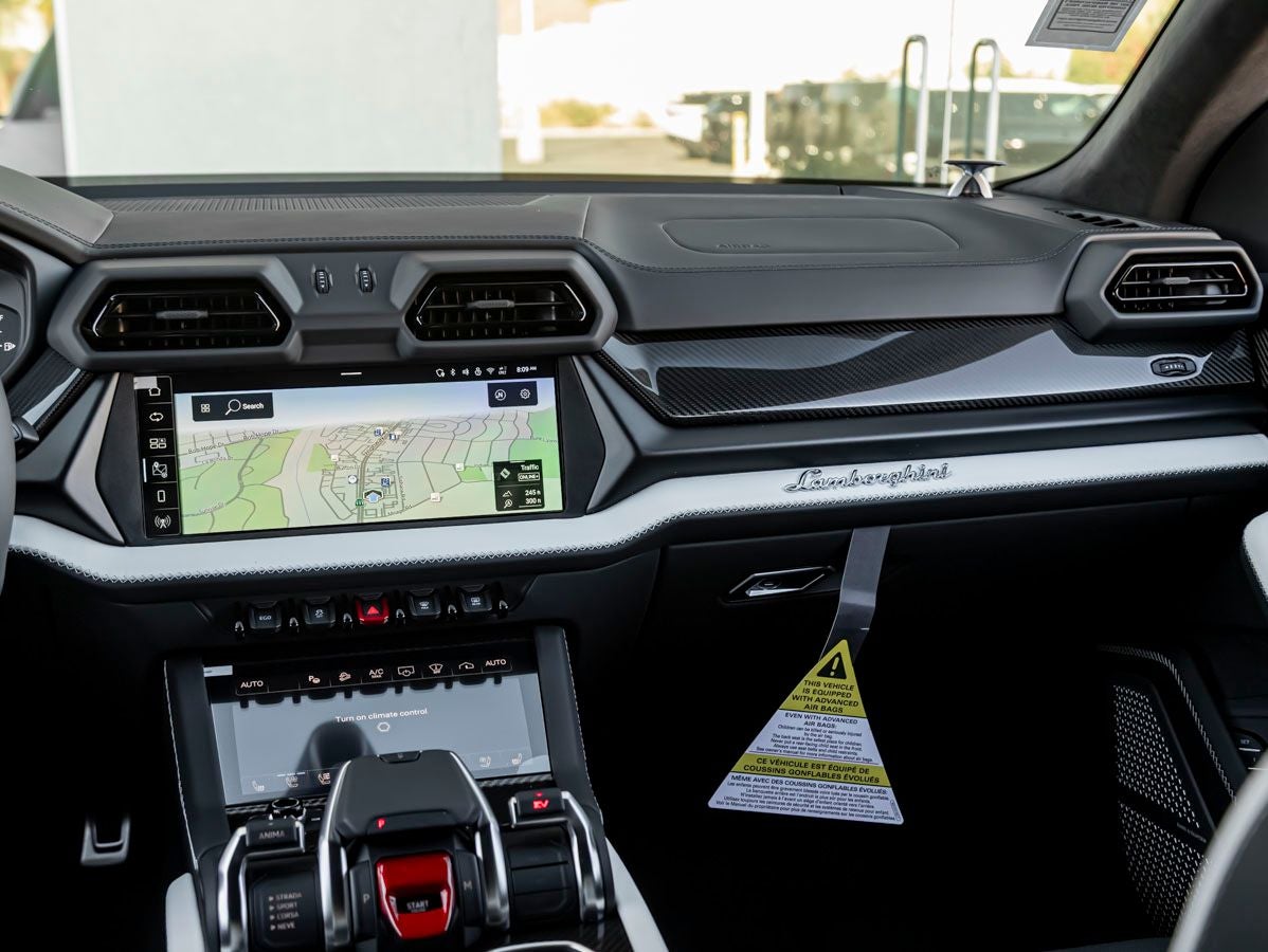 - Radio: Lamborghini Infotainment System -inc: 2 configurable full screen (12.5" and 8.6"), Lamborghini smartphone interface (Apple CarPlay and Android Auto), 3D maps navigation system, sound system (8 systems, 4 channels), music interface (USB), Bluetooth® connection and audio streaming, connect package w/connect service and active eSIM, e-call w/private call, phone box amplifier, phone box (wireless charging/connection to vehicle aerial), phone box w/coupling antenna including WLC and external antenna and voice control/recognition
