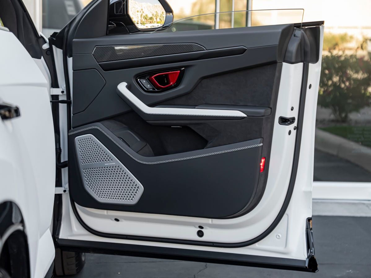 Step inside and the Nero Ade Sportivo Leather Interior welcomes you with unmistakable Italian craftsmanship. Enhanced by the Sportivo Leather Interior with Special Style Package and Small Interior Carbon Package in Shiny Finish, the cabin is both performance-focused and luxurious. Details such as Rosso Efesto Interior Door Handles, Cross Stitching, Optional Stitching on Seats and Steering Wheel, and the Embroidered Lamborghini Shield create a bespoke environment. Comfort and innovation are seamlessly integrated with Full Electric Front Seats, Ambient Light Package, Premium Air Quality System, and the immersive Advanced 3D Bang and Olufsen Sound System.