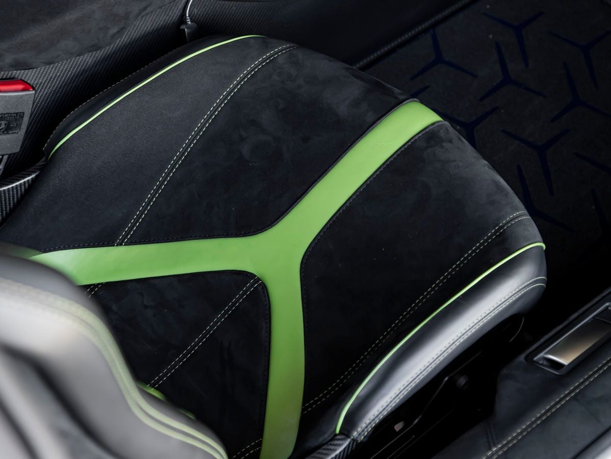 The Aventador SVs commanding presence is impossible to ignore, defined by its aerodynamic precision and race-inspired design. From its aggressive front fascia to its dramatic rear profile, every element serves both form and function. This example is enhanced by the Transparent Engine Bonnet, showcasing the heart of the V12, along with X-Frame and T Braces in the engine bay for added visual drama. The Dianthus 20 and 21 forged wheels and Big SV logo painted further emphasize its track-focused character, while extensive visible carbon fiber (Ad Personam) elevates its exclusivity and lightweight performance credentials.
