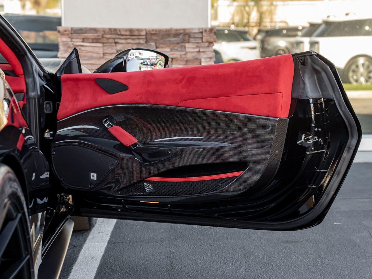 The 488 Pistas sculpted bodywork is a direct result of Ferraris motorsport expertise, with every vent, contour, and carbon fiber element engineered for maximum aerodynamic efficiency. Finished in deep Nero, its purposeful stance is amplified by dramatic 20 Forged Gold Rims, creating a bold contrast that commands attention. Signature Yellow Brake Calipers provide an unmistakable Ferrari accent, while Engine Covers in Carbon Fiber and Carbon Fiber Inner Sill Trim highlight its lightweight, performance-focused construction. Enhanced further with Novitec Lowering Springs and a Hi Flow Exhaust and Cats, this Pista delivers an even more aggressive presence and an unmistakable soundtrack.