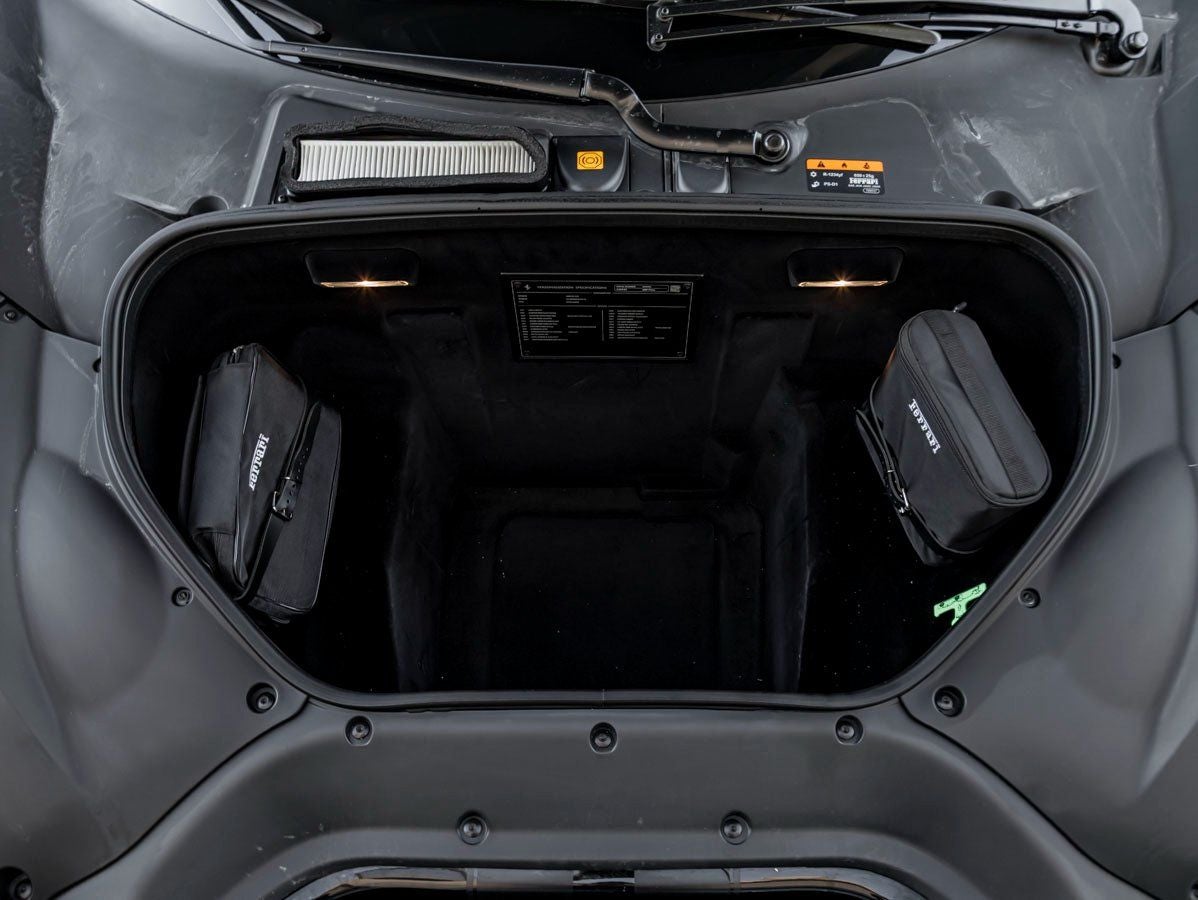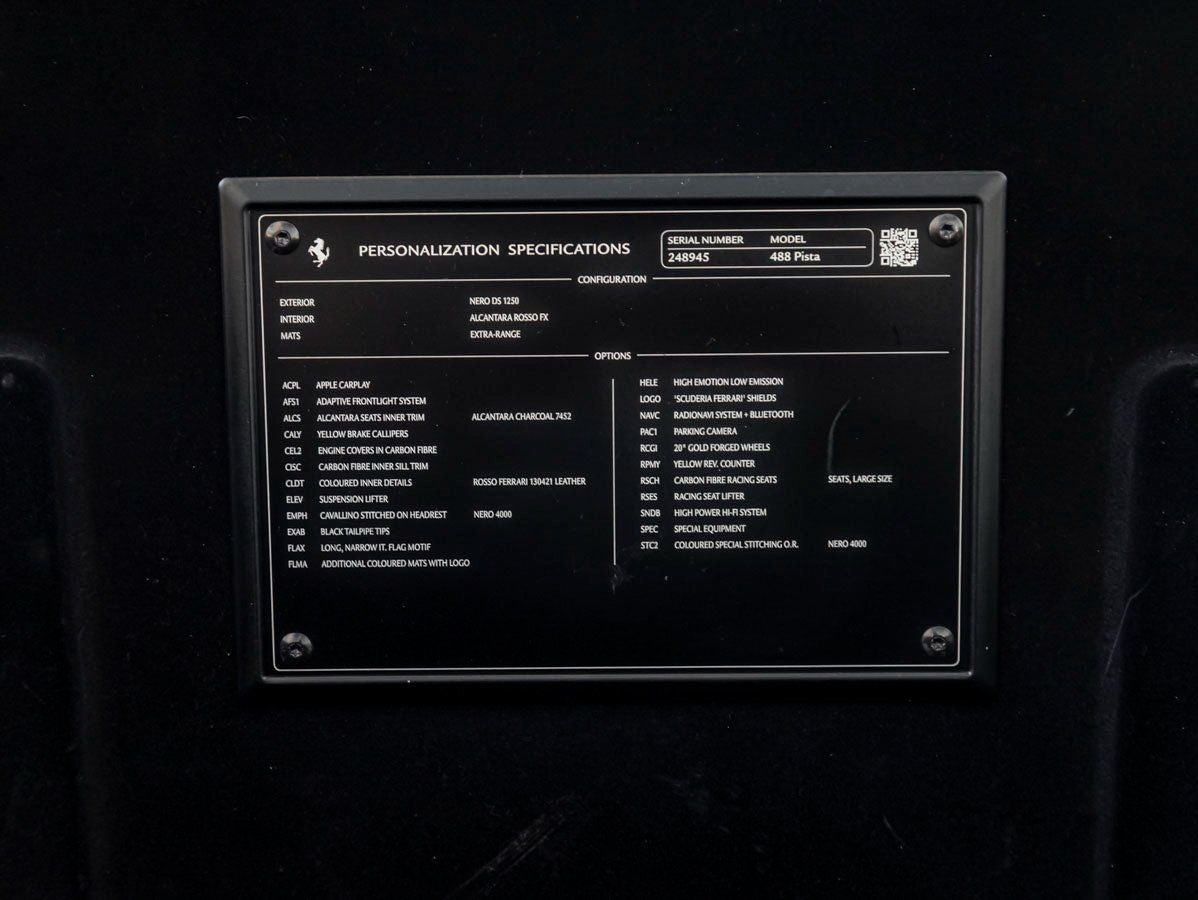 Inside, the Nero cabin is a driver-focused cockpit crafted with precision and intent. Alcantara Seats Inner Trim provide lightweight performance and refined comfort, while the iconic Horse Stitched on Headrests pays tribute to Ferraris heritage. Colored Mats with Logo add a bespoke touch, and the Racing Seat Lifter ensures an optimal driving position for spirited performance. Every surface and detail reinforces the Pistas missionpure, undiluted connection between driver and machine.