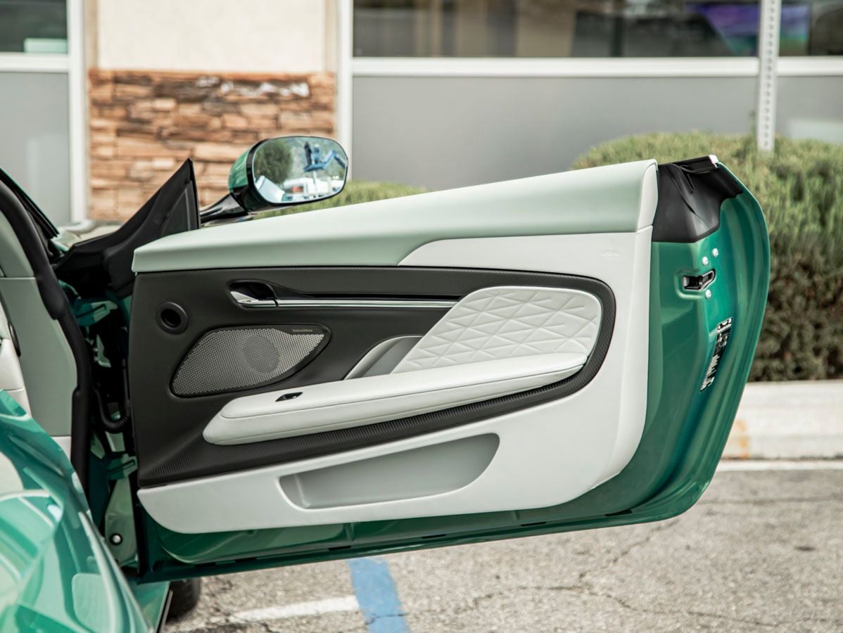 The DB12 Volantes sculpted silhouette is a seamless blend of athleticism and elegance, designed to captivate from every angle. The mesmerizing special Iridescent Emerald paint enhances the cars flowing lines, while the black lower pack and dark chrome jewelry pack add a modern, aggressive contrast. Completing the look are striking 21 multi-spoke forged S wheels in black and smoked rear lamps, creating a bold yet refined road presence. The AML special convertible hood provides open-air exhilaration with uncompromising style.