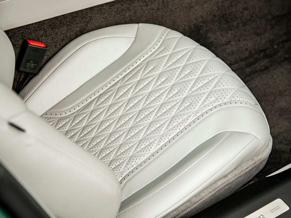 Inside, the cabin is a sanctuary of contemporary luxury and craftsmanship. The Inspire Duotone interior is beautifully appointed in contemporary leather and carpet colors, delivering a harmonious blend of color and texture. Every detail is thoughtfully curated, from the graphite seatbelts to the premium materials throughout. The driver-focused cockpit is enhanced by a heated steering wheel, ensuring comfort in every season while maintaining Aston Martins signature refinement.