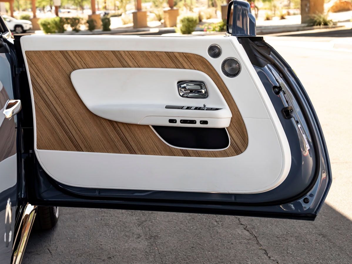 Step inside to experience a sanctuary of futuristic luxury, where craftsmanship meets cutting-edge design. The Grace White interior creates a serene and luminous environment, beautifully contrasted by Navy Blue stitching, colored inner stitching, contrast seat piping, and RR Monograms on all headrests. Open Pore Paldao wood trim introduces a natural elegance, while Canadel Doors provide a bold and immersive design statement. The Illuminated Fascia and Indulge Bespoke Clock add a sense of theater and refinement, while the veneered steering wheel spokes and colored steering wheel in Navy Blue showcase Rolls-Royces unparalleled attention to detail.