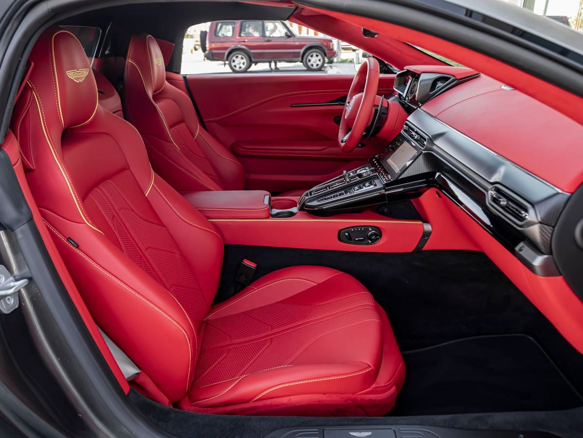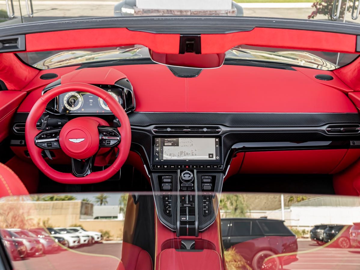 The Vantage Roadster commands attention with its athletic stance, sculpted body lines, and unmistakable presence. The Signature Metallic Magnetic Silver paint enhances its sleek and aggressive profile, while the black vaned front grille, black upper and lower packs, and dark chrome jewelry accents add a modern and performance-driven edge. Completing the look are distinctive 21 Y-spoke forged satin copper bronze wheels, smoked tail lamps, and bold red brake calipers, delivering a refined yet commanding road presence.