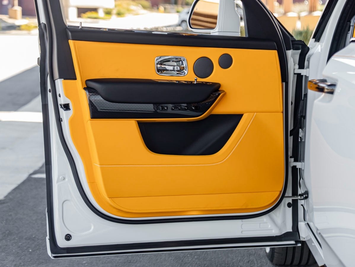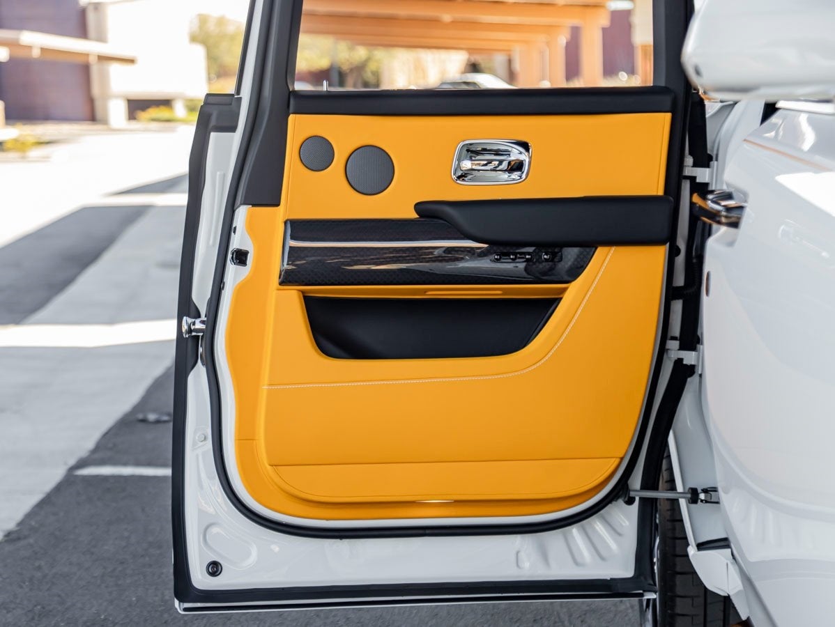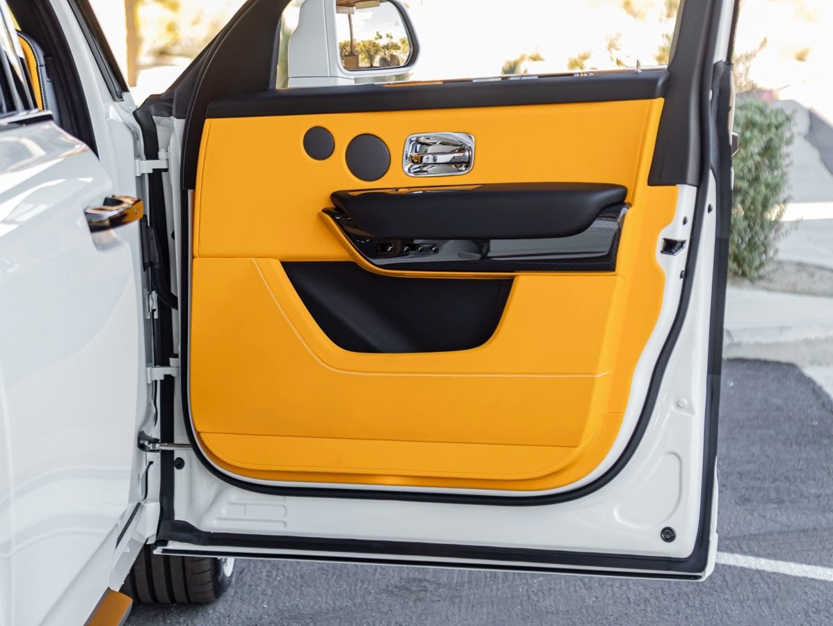 Write me a professional vehicle description similar to the one above that also highlights key features for a Certified Pre-owned 2026 Rolls-Royce Black Badge Cullinan in English White over Forge Yellow and 94 miles with the following options being sold at Rolls-Royce Motor Cars Rancho Mirage.